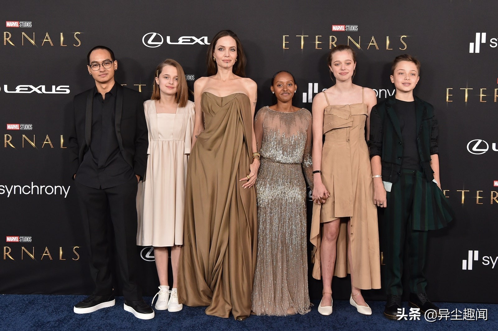近期朱莉在宣传新电影《永恒族》时,她也特地带着孩子们亮丽现身,除了和16岁的扎哈拉、15岁的希萝一起走红毯之外,也带着其他孩子一起幸福合影,其中站在最右边的13岁诺克斯,帅气模样更是让人忍不住多看几眼呢!