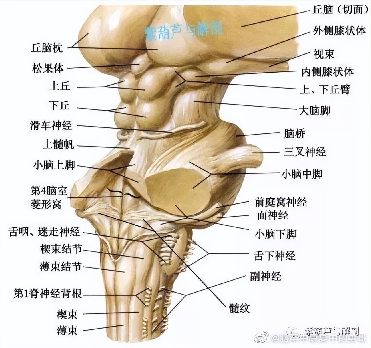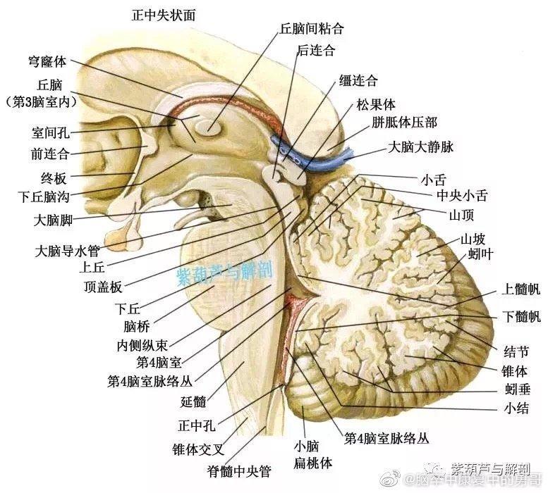 中脑:上界是间脑的视束,下界为脑桥上缘。主要结构有:大脑脚、中脑导水管、四叠体(左右上、下丘)