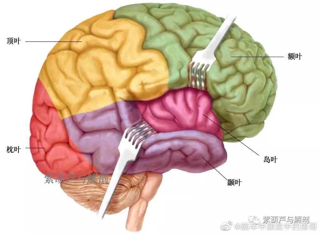 额叶:人类躯体运动中枢位于额叶中央沟前部的脑回路;其次与精神、语言也有关。