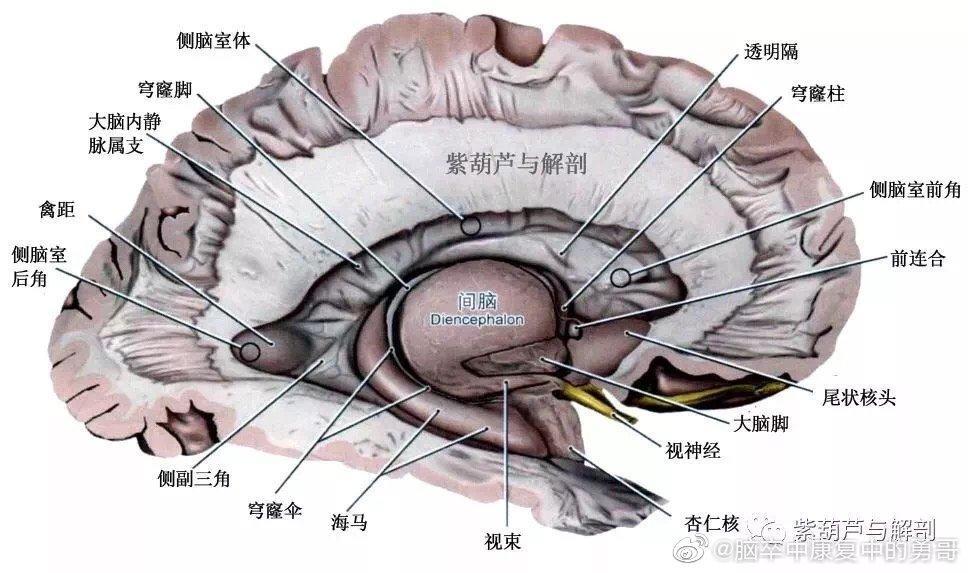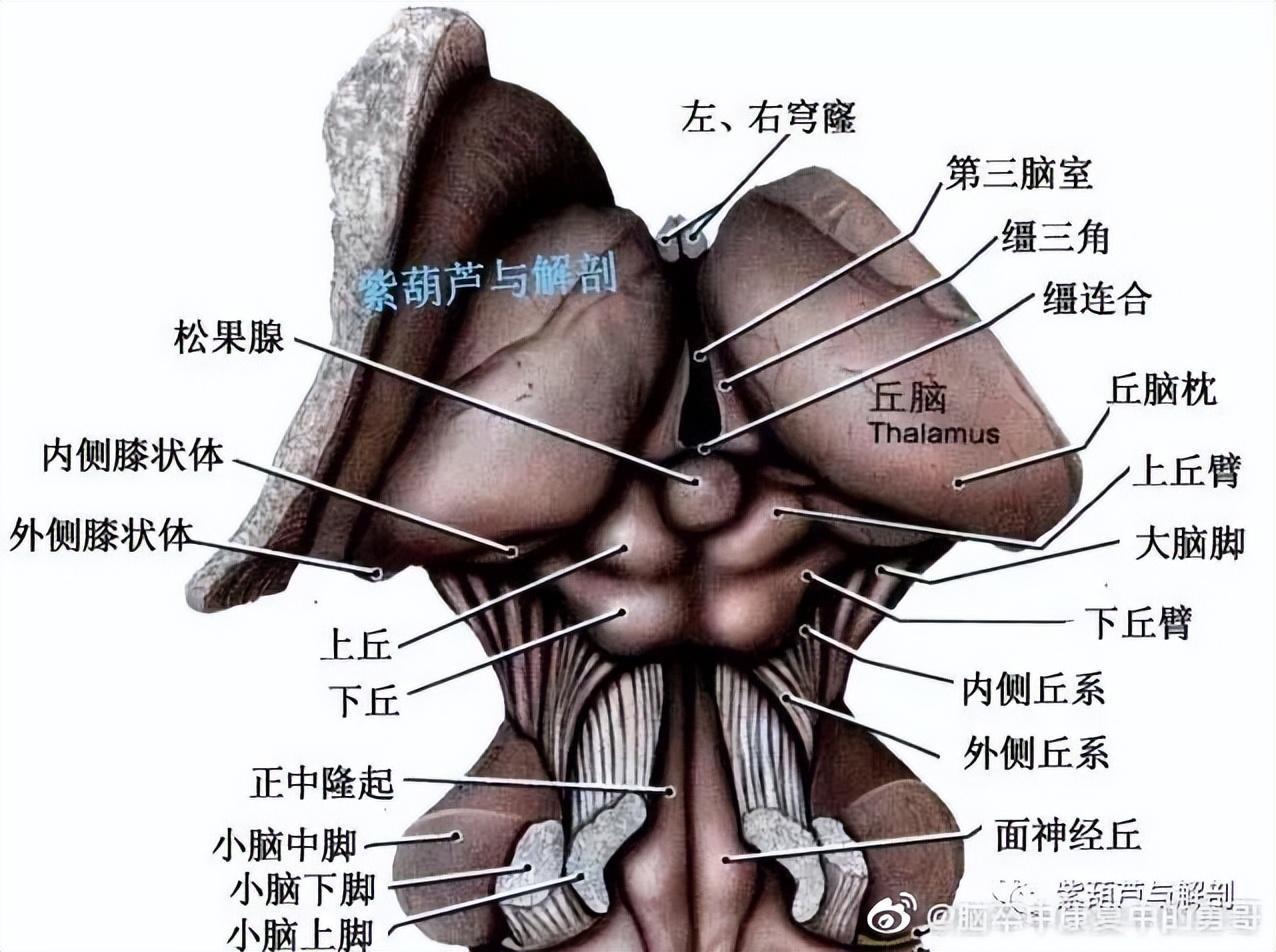 间脑属于前脑的一部分,位于前脑和中脑间,大部分结构在第三脑室外侧,体积不到中枢神经系统的2%,结构极其复杂(简单带过)。主要由丘脑和下丘脑组成,但还包括较小的底丘脑和上丘脑。间脑几乎完全嵌入人大脑半球内,因此其大部分是隐藏的。