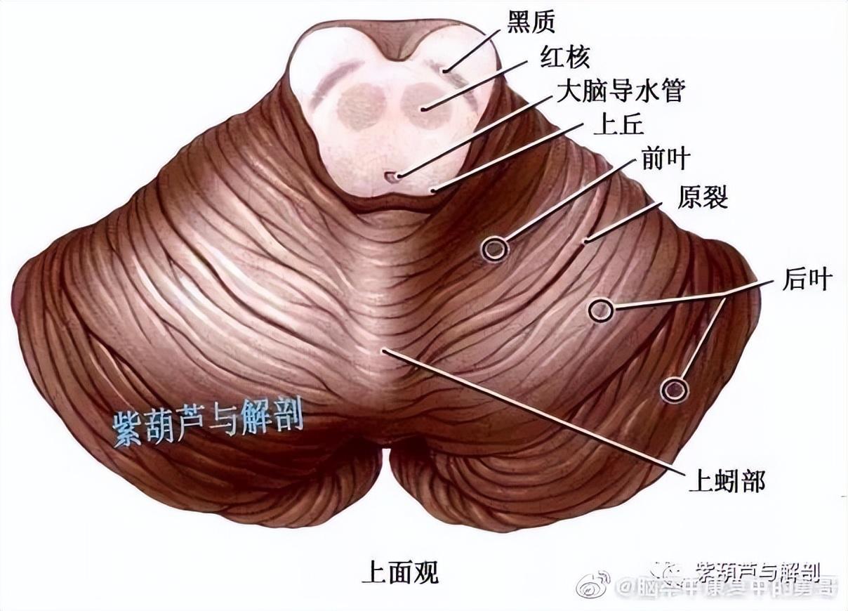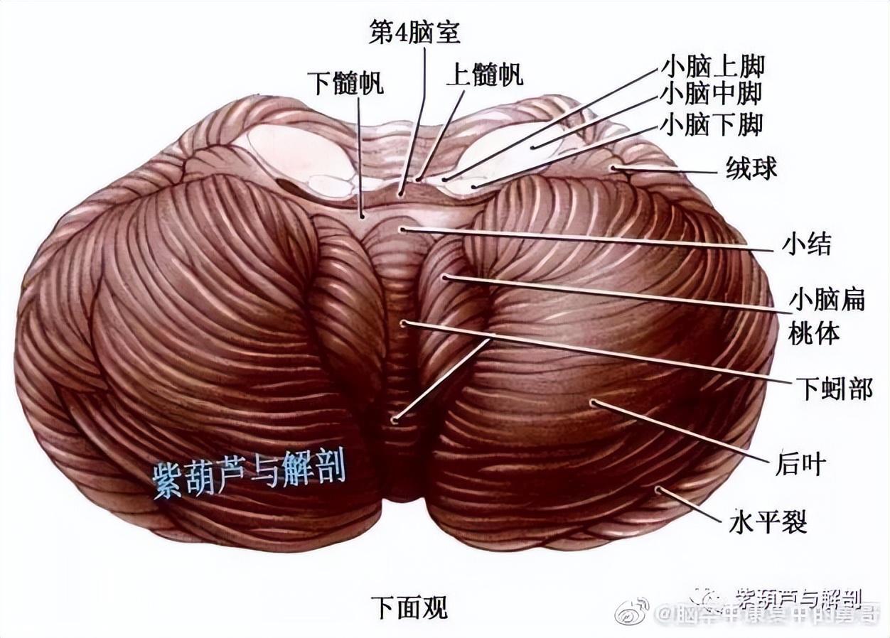 小脑有成对的小脑半球和中间的蚓组成,在脑桥、延髓背部,中间夹有第4脑室,能过三对小脚与脑干相连,小脑脚内含有传入和传出小脑的纤维。小脑占据颅后窝,表面被覆小脑幕。