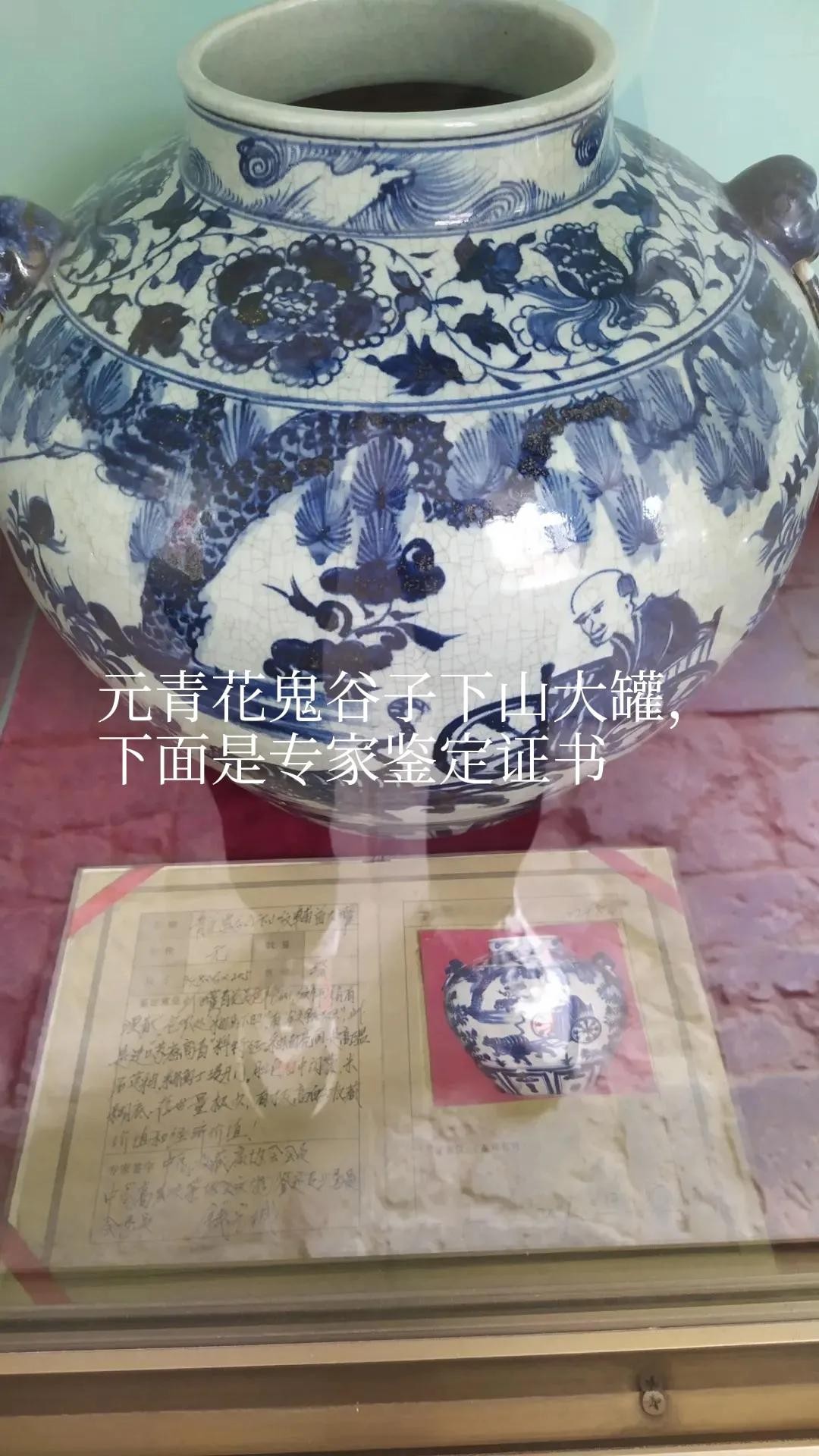 侧院是珍宝收藏馆,有许多代表晋商文化的宝贝,其中有个国宝级的元青花鬼谷子下山大罐引起了我极大兴趣,同款在2005年的时侯,在英国伦敦佳仕得拍卖,当时折合人民币成交价为2.3亿元,创下中国瓷器拍卖额最高记录,瓷器下面有古玩鉴定师钱宝城先生出据的鉴定书,这个保真应该是没有问题了。