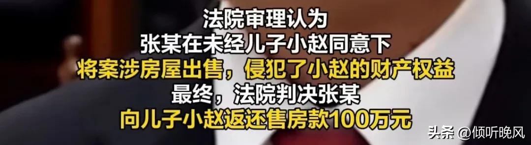 最终法院做出判决:张某未经小赵同意就将房屋出售,属于侵犯小赵的财产权,所以张某应将100万元归还儿子小赵。