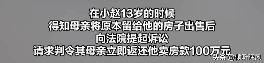 然而在儿子小赵13岁的时候,得知妈妈将留给自己的房子卖了,就向法院起诉,要求妈妈将100万元还给自己。