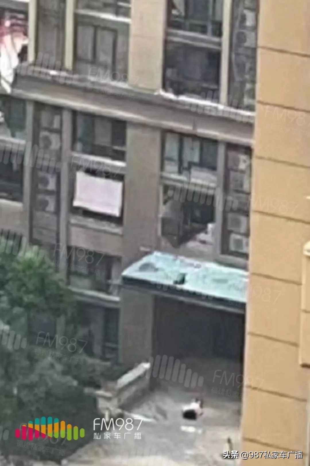 记者从报料人提供的图片看到,疑似一名女子从楼上坠落,砸穿大门前玻璃雨棚后面朝下躺在地上。