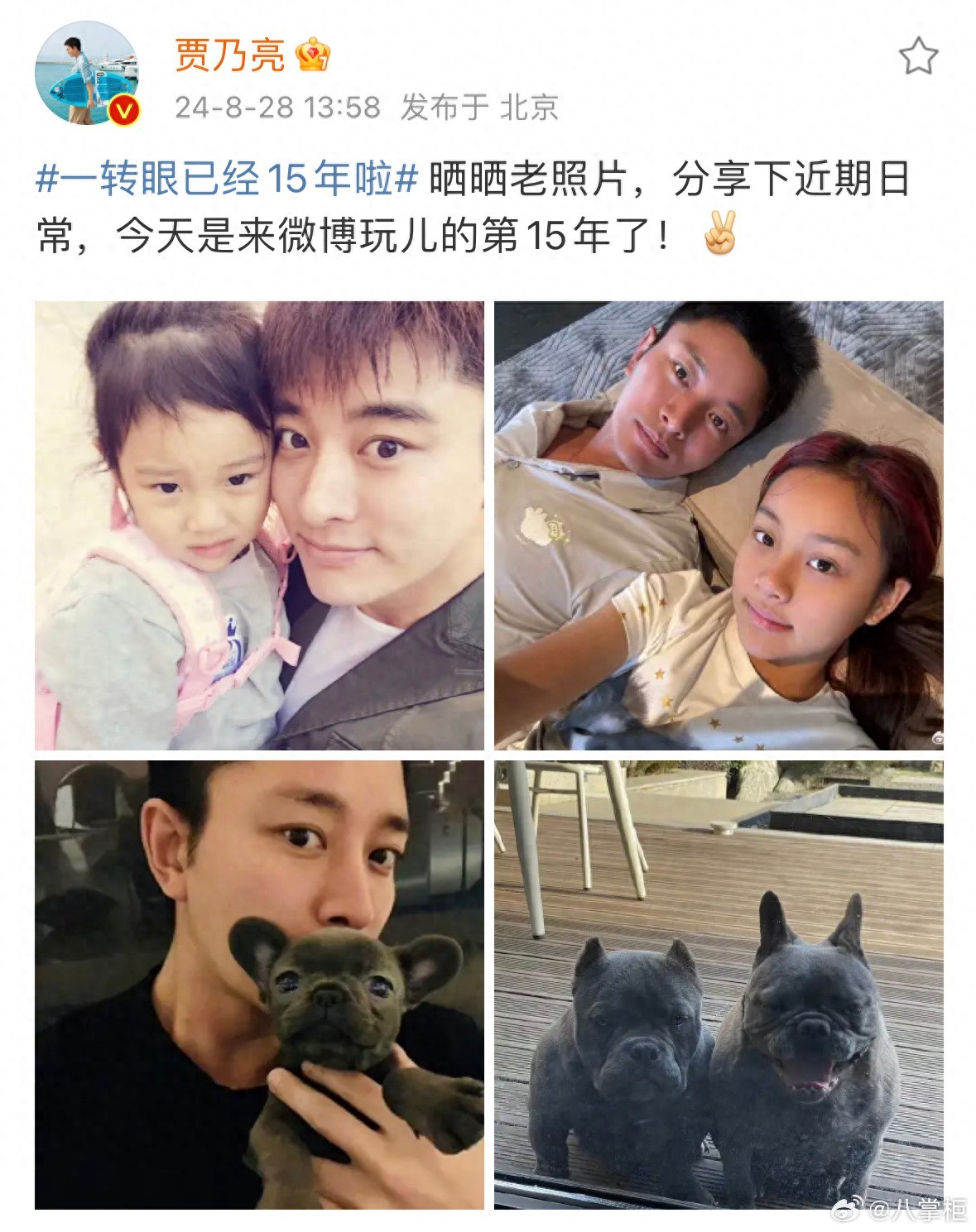贾乃亮在微博上不仅晒出了这组合影,还分享了一些近期的日常生活。他表示,今天是他玩微博的第15年,这让他更加感慨时间的流逝和社交平台的变化。