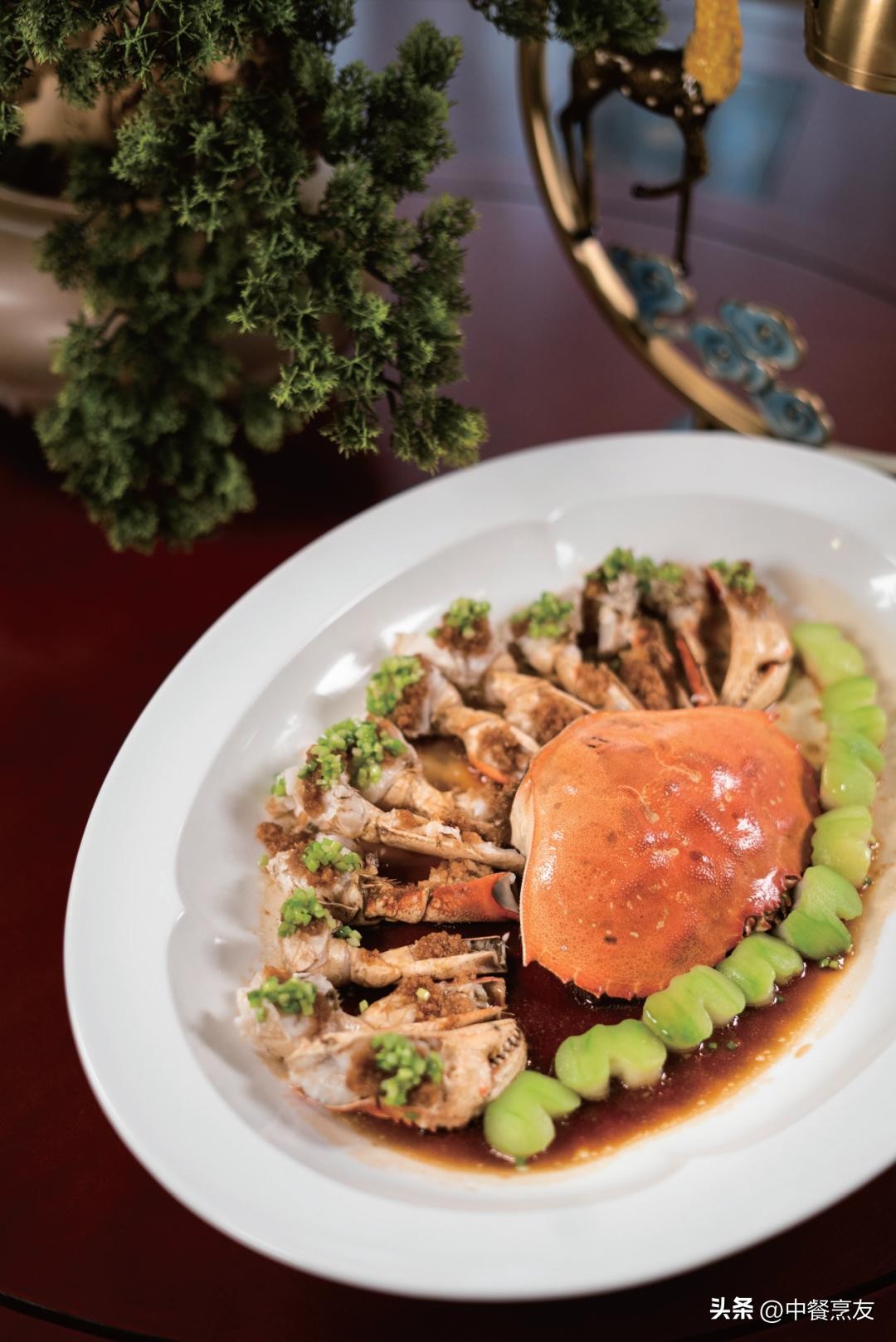4.将金蒜酱均匀地舀在珍宝蟹蟹钳上,放入蒸箱蒸6分钟至熟,取出来;蒜薹花用热油烫香,加入少量盐调味,舀在蒸好的蟹钳上点缀增香;另将调好的汁水淋在苹果丝瓜和蟹肉上增香调味,即可。