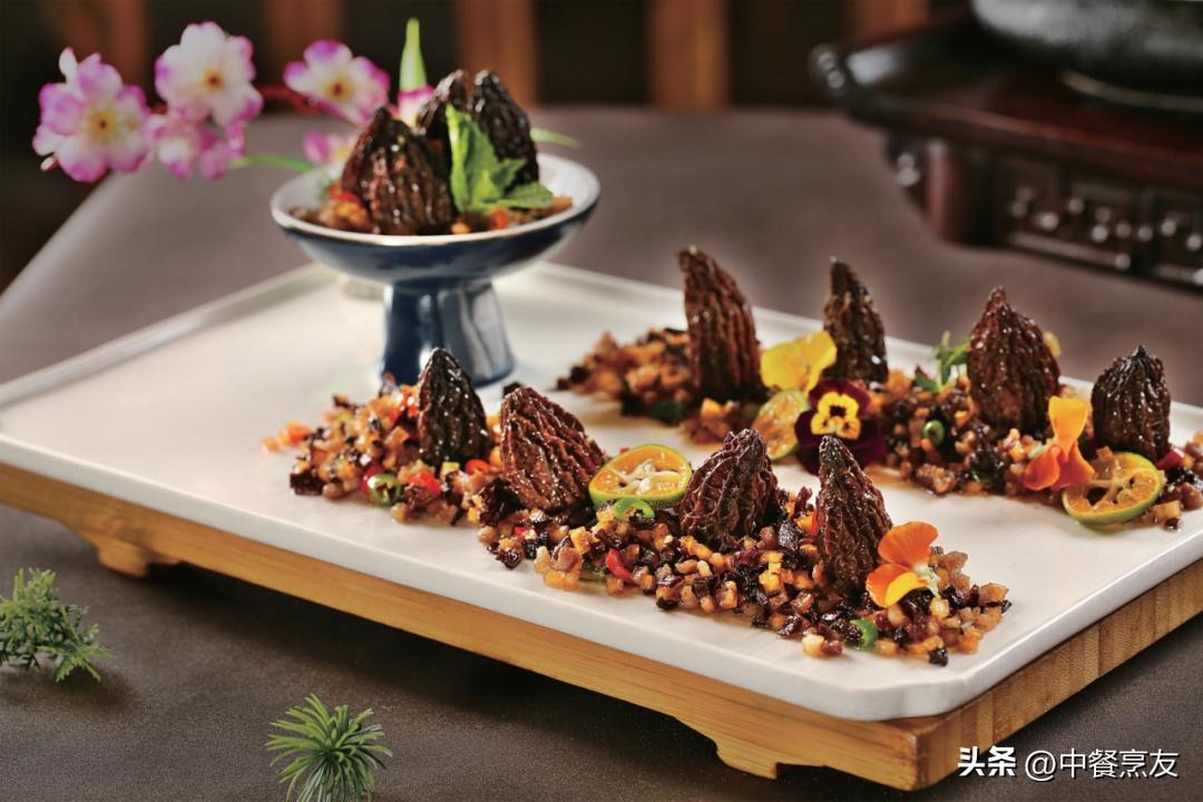 说明:瓤羊肚菌时要先扑点生粉在羊肚菌里,防止成菜时虾胶掉落。这个菜是收汁菜,不能勾芡。