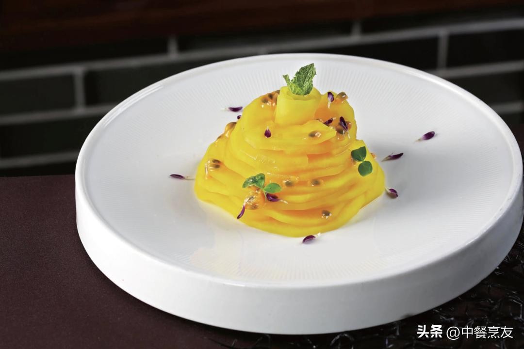 4.出菜时捞出木瓜片,堆码成型,稍点缀,淋适量百香果肉即成。