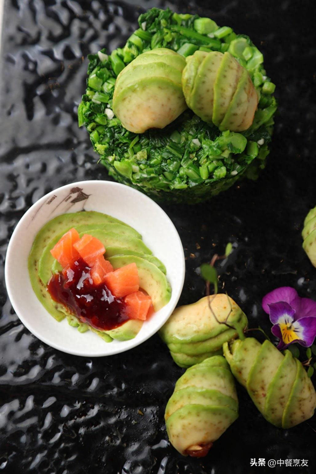 2. 把切好的牛油果片平铺于保鲜膜上,放入拌好味的三文鱼丁,用挤捏的方式成型,装盘稍加点缀,摆在做成筒状的熟菜心粒旁边,即成。