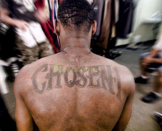 ——CHOSEN1(天选之子):在詹姆斯的背部上方有一个“CHOSEN1”纹身,CHOSEN意为选择、精选,在宗教文化中有上帝挑选的意思,数字1代表的是第一的意思,整个纹身的含义就是精选的一个。天选之子是《体育画报》封面给詹姆斯的头衔,据说他在高中时就已经拥有了这个纹身。