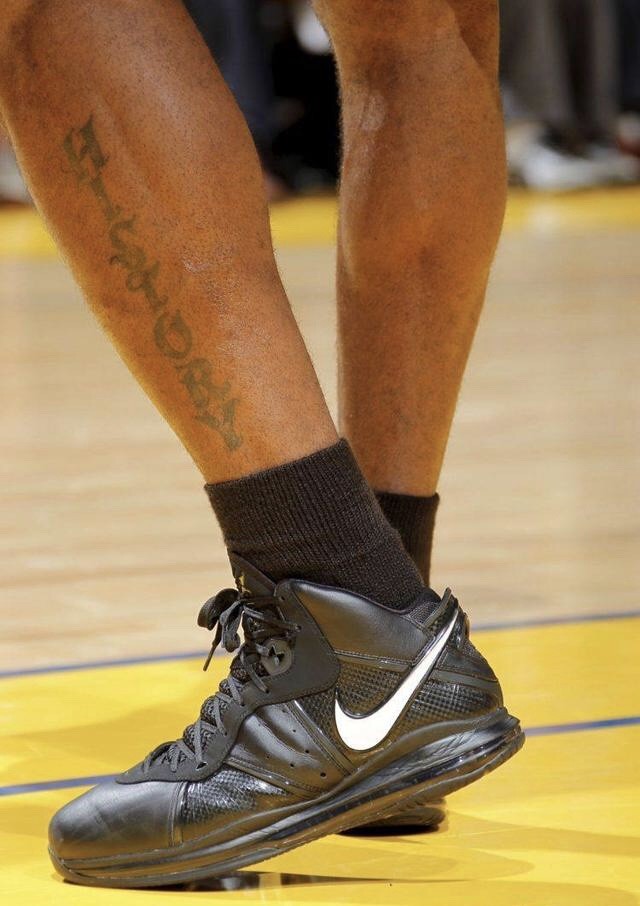 ——L&J:在詹姆斯的三头肌自豪地以“L”和“J”字母为特色进行了着墨,这是他的名字的首字母缩写。这个纹身出现在2007年季后赛第二轮休息的六天期间,而骑士队正在等待他们的下一个对手。