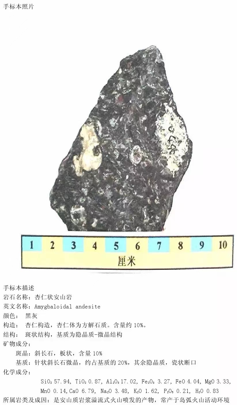 安山岩因盛产于安第斯山而得名,多为紫红、深灰色,斑状结构,基质为玻璃质或玻璃隐晶质,块状构造和杏仁构造居多,少有气孔构造。杏仁状安山岩经常与沸石矿一起出现在凝固岩浆气泡留下的空洞中,并把它填满。