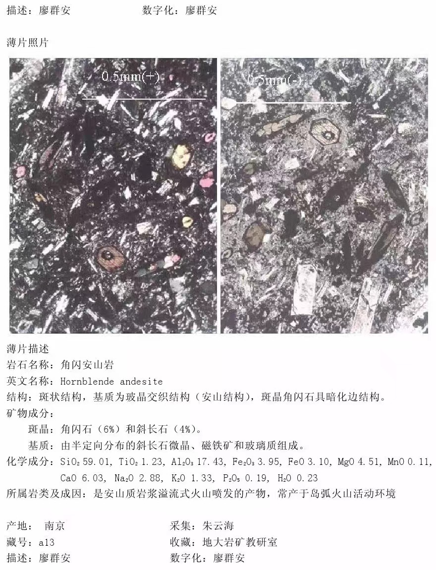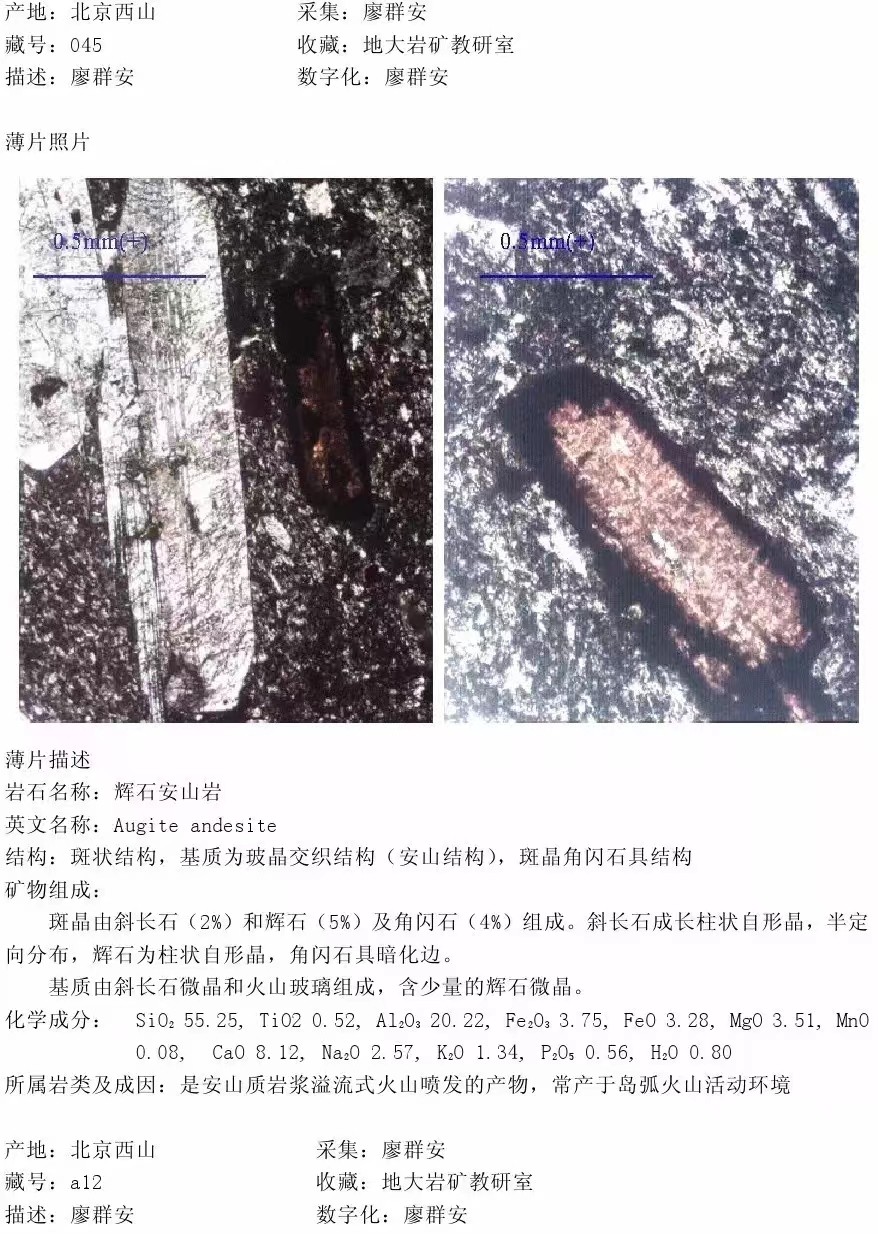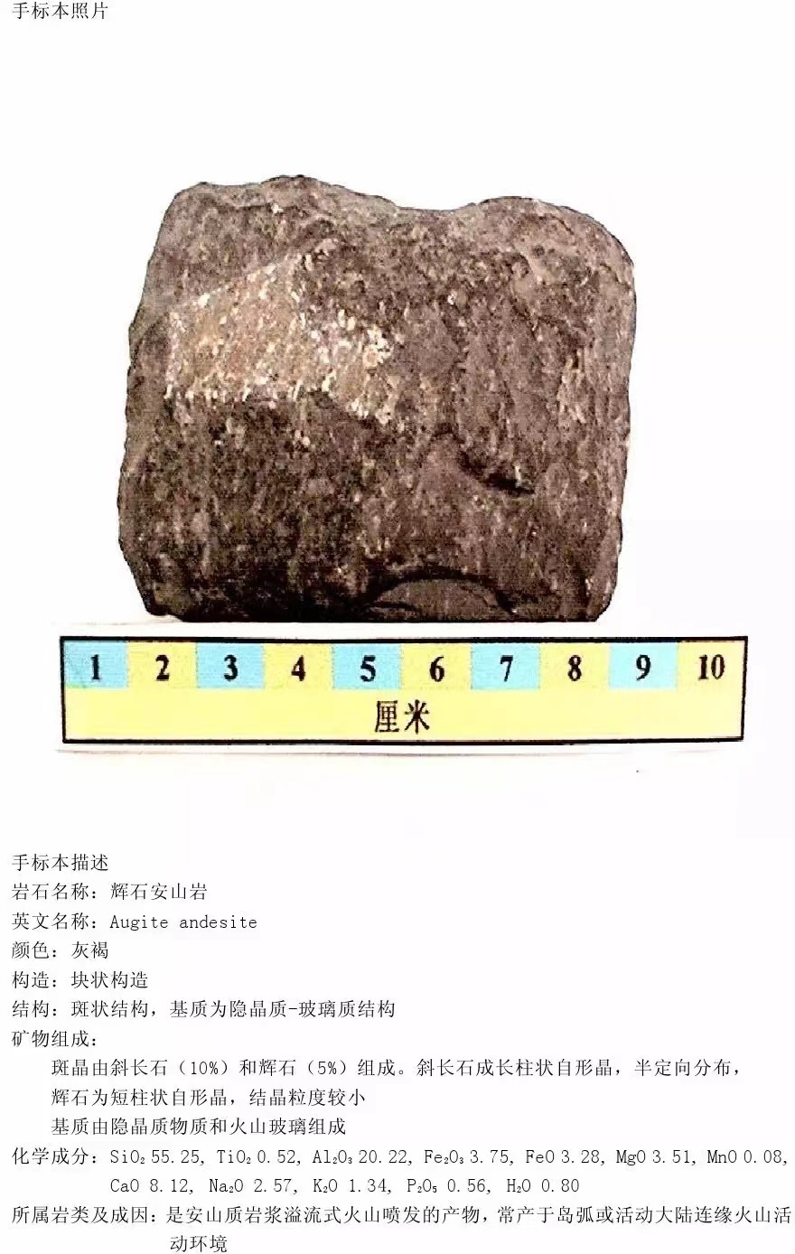 安山岩浅色矿物斑晶为斜长石,暗色矿物为辉石、角闪石、黑云母。长石和辉石的较大斑晶在细粒基质中形成时会产生斑晶安山岩。