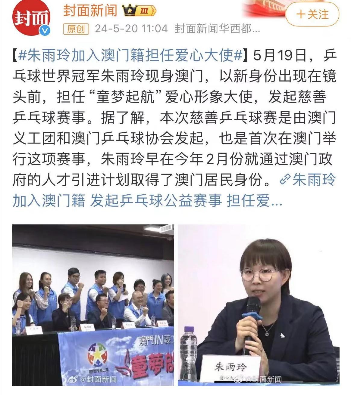 2024年2月,朱雨玲通过澳门政府的人才引进计划,正式获得了澳门永久居民身份。作为前国乒世界第一水平的球员,朱雨玲的这一身份无疑受到了各界的广泛关注。