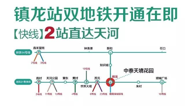 中泰天境花园坐拥地铁21号线(建设中)、地铁14号线(建设中)以及穗莞深城际轻轨(建设中),项目紧邻镇龙地铁站,双地铁开通在即,穗莞深城际轻轨年底开通,快线2站到天河区、6站到珠江新城。