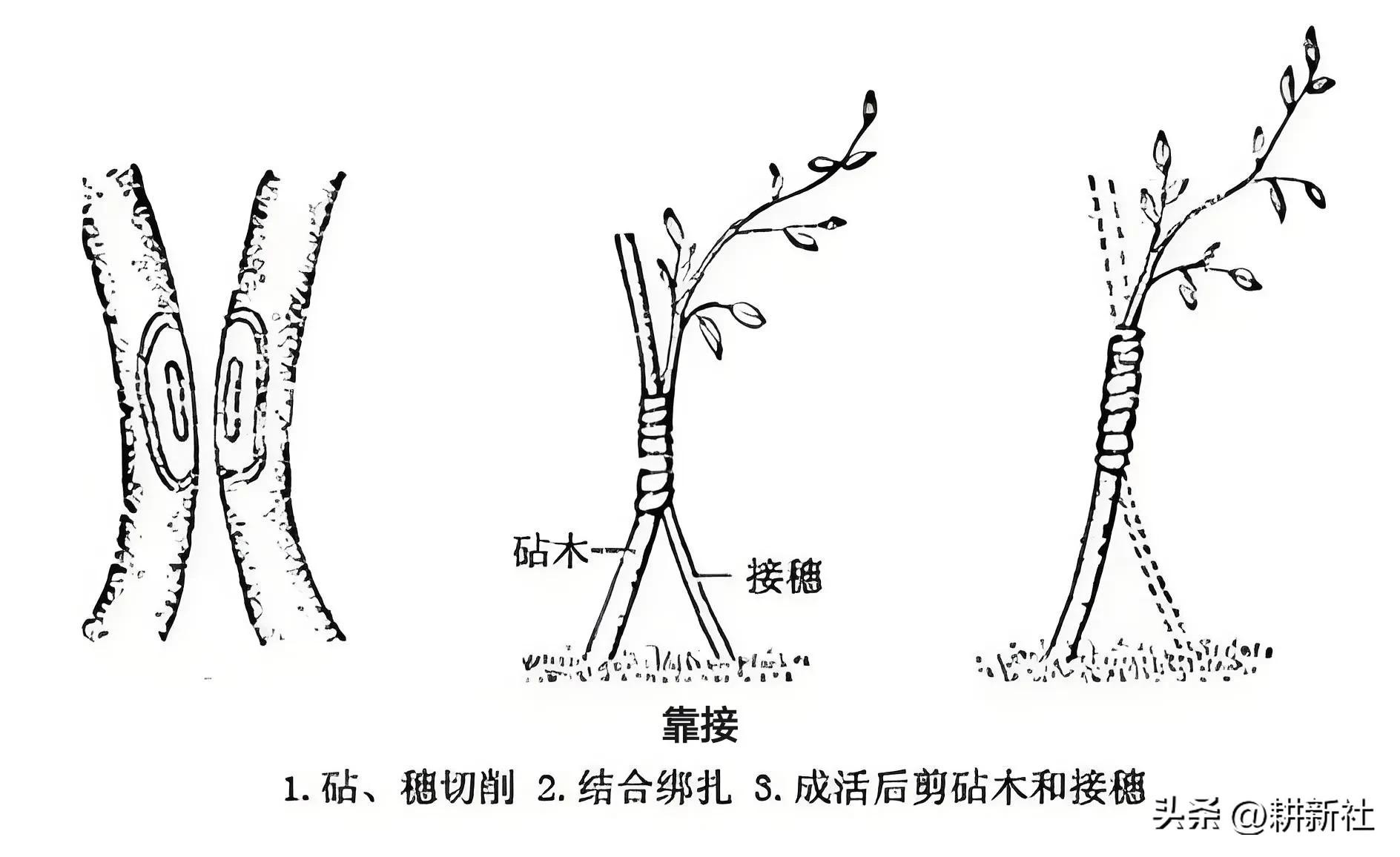 3. 后期管理:2个月后愈合,剪断接穗下端和砧木上端,完成独立植株。
