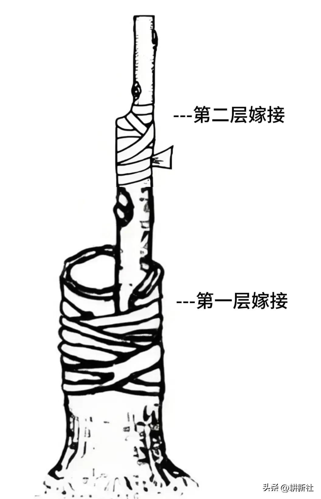 3. 第二层嫁接:在中间砧上嫁接目标品种(如红富士苹果)。