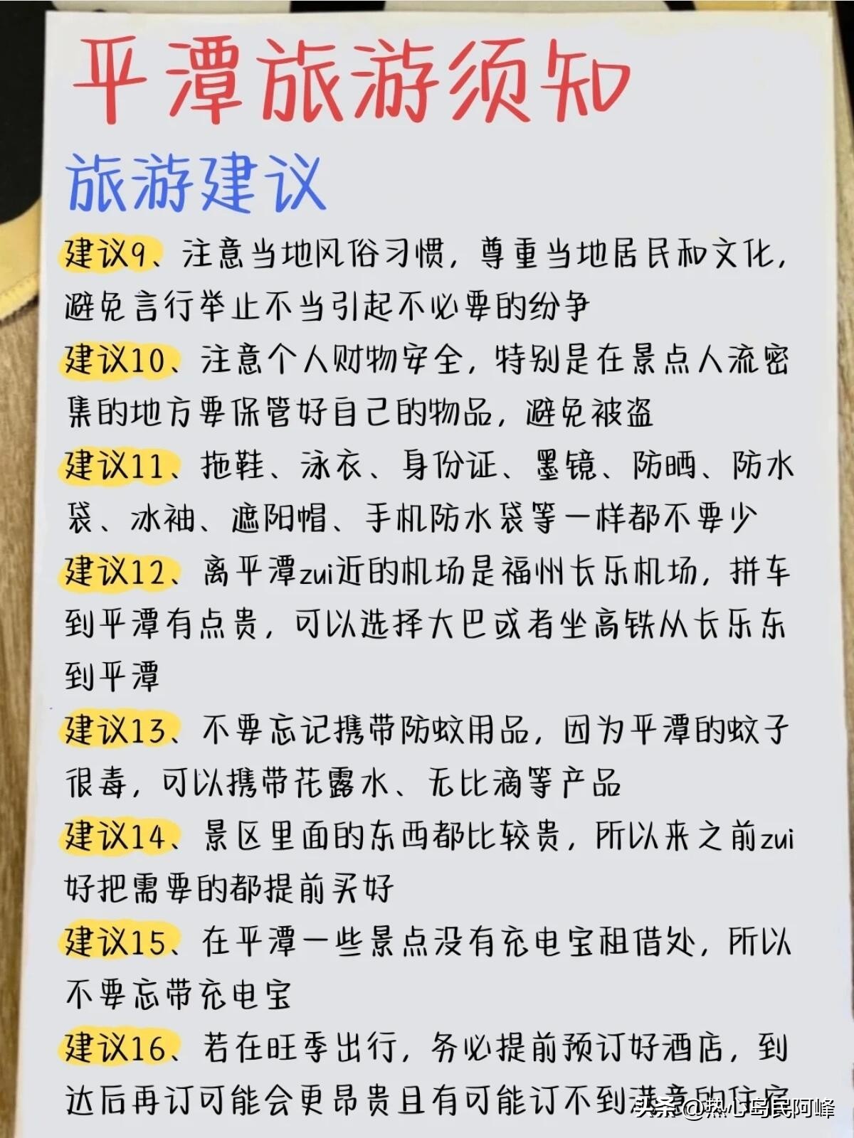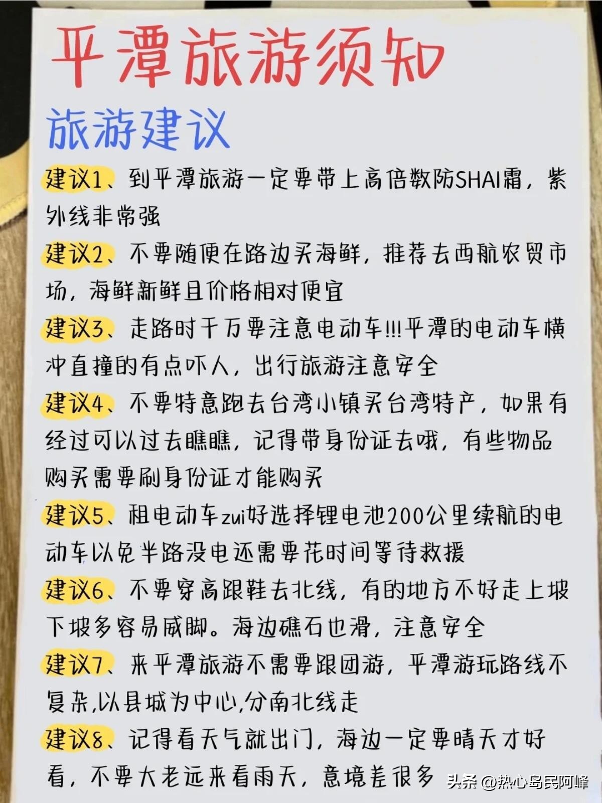 出门前,出行前,瞅一眼潮汐表、天气预报,那可都是“寻宝图”,按着来,才能精准追到美景。住宿旺季得提前预订,海景民宿能伴着涛声做美梦,城区酒店出门方便,各有各的好。轻装上阵,别拖拖拉拉,赶紧奔赴平潭,赴这场有诗有远方的约会,让美好回忆填满行囊!#是时候去一趟平潭了##福建旅游##平潭旅游#(部分图片、素材来源网络)