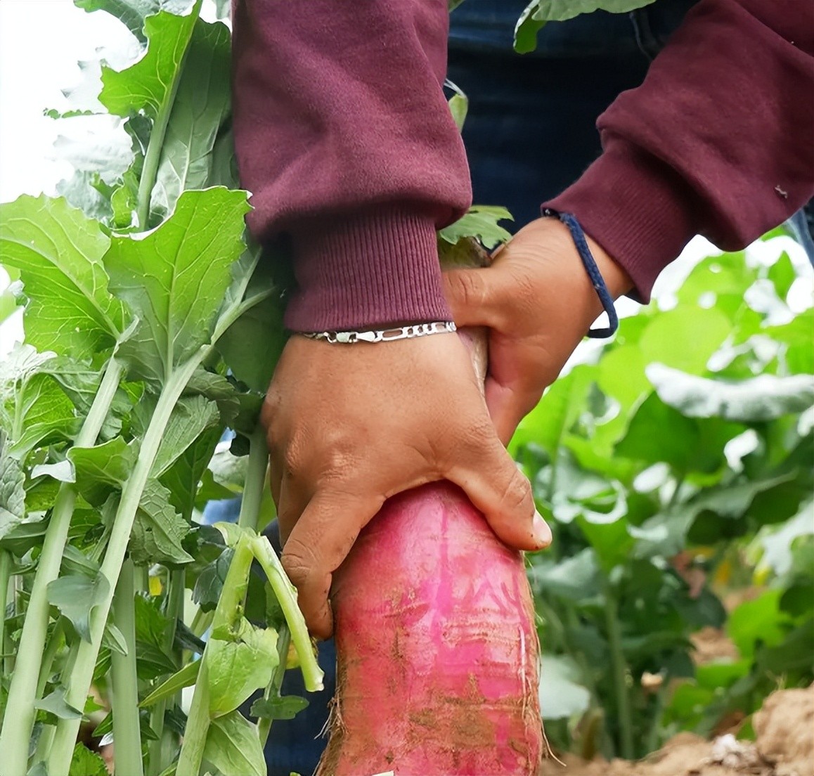 From a few metres away, we could make out the crimson crowns and thick red stems of 20 tonnes of giant radishes breaking through the cracked ground.
