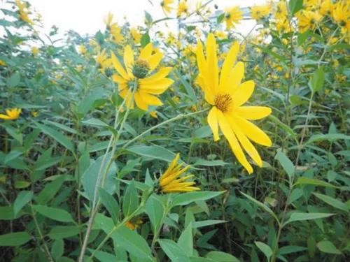 鬼子姜又叫洋姜,野姜,夏天开出黄色的花朵,形状像葵花一样,鬼子姜长的很高,微风轻轻一吹,它们立刻摇曳出优美的舞姿。