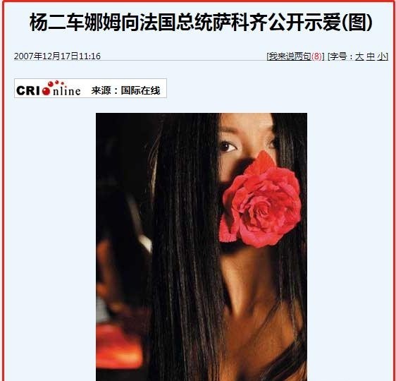 并且,杨二车娜姆给出的理由也是相当古怪,竟然直言自己喜欢萨科齐的肤色,他说话的举止以及吃饭时的动作都很可爱。