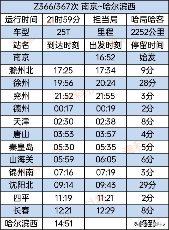 哈尔滨开往南京的直达特快列车,途经四平、天津,全程2252公里