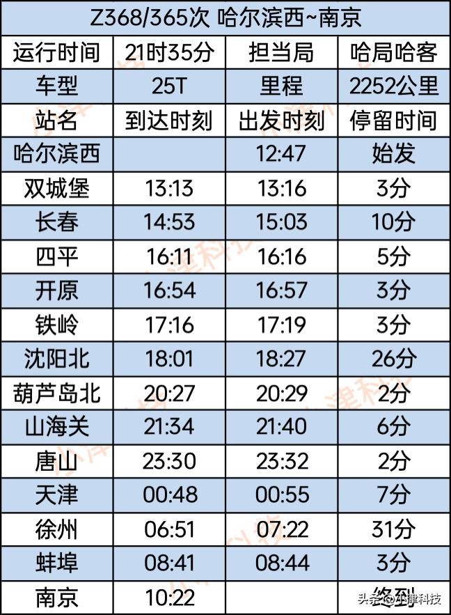 哈尔滨西站至南京站Z368/365次运行21小时35分,经停哈尔滨西、双城堡、长春、四平、开原、铁岭、沈阳北、葫芦岛北、山海关、唐山、天津、徐州、蚌埠、南京。