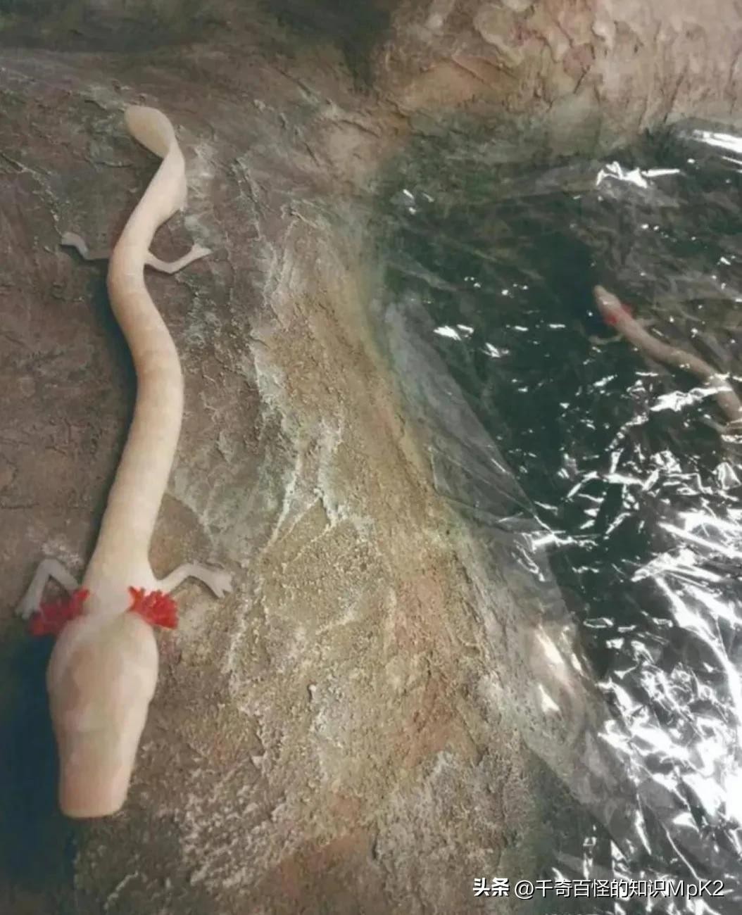看上去像是蜥蜴,但四肢又太过短小,本身的体长一般在三十厘米左右,由于长期生活在暗处,身体的颜色呈现白色。