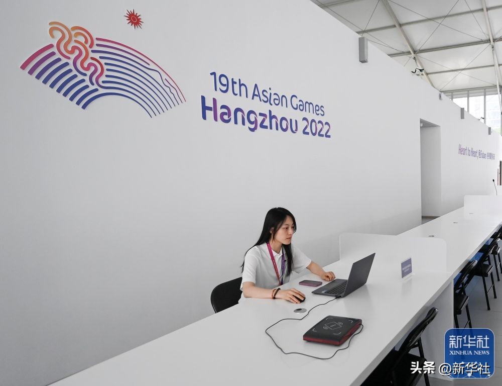 6月16日,一名工作人员在杭州亚运村欢迎中心工作。欢迎中心包含代表团欢迎中心、媒体中心和访客中心三个部分,其中代表团欢迎中心是所有代表团抵达亚运村的第一站,将提供24小时全天候服务。