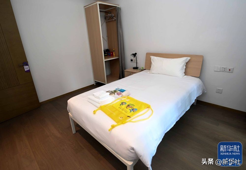 这是6月16日在杭州亚运村运动员村拍摄的运动员房间。放在床上的是赛时为运动员提供的洗漱包。房间物品除了满足运动员赛时日常需求之外,绿色环保也是重要因素。例如洗漱包中的漱口杯以及配置的衣架采用麦秸秆材质,环保可回收。