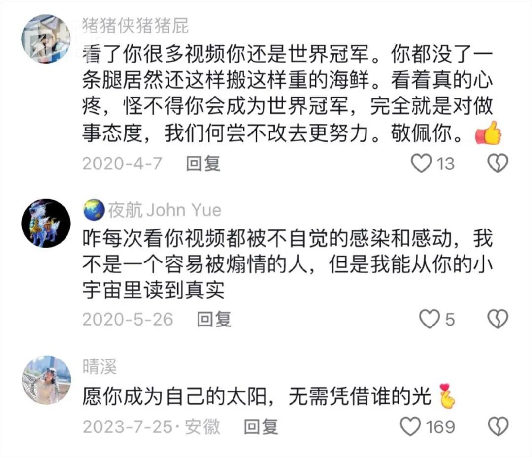 我的故事打动了很多人,在抖音,我感受到了现实生活中未曾有过的善意。有人说,每次看我的视频都会不自觉被感染和感动,因为读到了真实;更多人鼓励我,拿出以前的拼劲,拼出一条属于自己的路;也有像我一样有身体残疾或者生活困难的人,分享自己的经历和故事,给予彼此力量。我更欣慰的是,有很多真正买过我们家海鲜的网友留言,说产品新鲜、便宜,我觉得这是对我人品和能力的一种认可。
