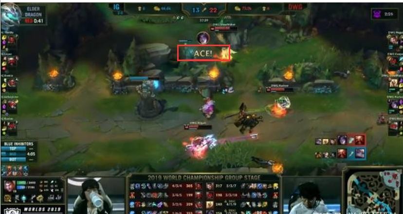 “Ace”指代团灭,不仅仅是在《王者荣耀》里。在正在举行的S9世界赛上,上届卫冕冠军iG刚刚吃了本届小组赛中第一场败仗,也是因为Ace。尽管The Shy阿卡丽再现飞雷神之术,一个人将DWG四个人打得四散而逃,但在双方下路开始火拼后,凭借着远古龙加持以及装备领先,DWG上单和辅助击杀打出来全场第一次ACE结束比赛。