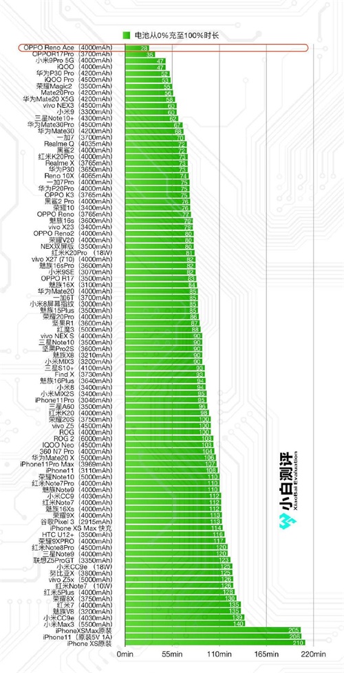 知名测评博主放出了一个直观的横向对比图,足见OPPO Reno Ace的王牌充电功能可谓打遍天下无敌手。