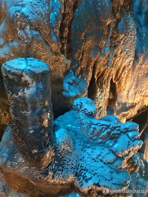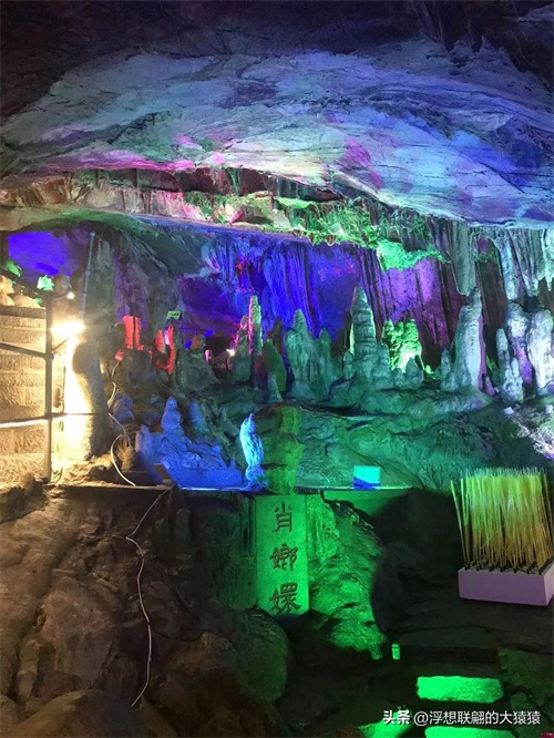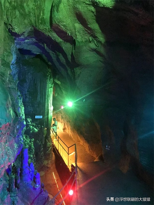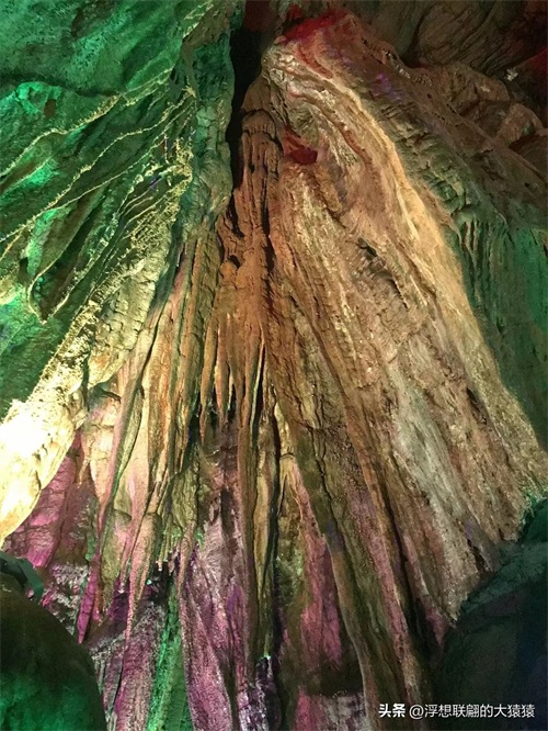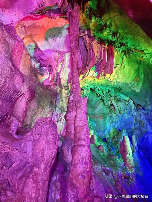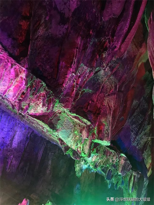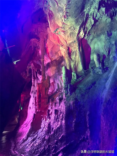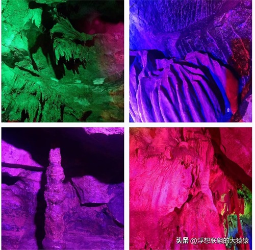 溶洞曲折幽深,怪石离奇,穹形“大厅”,狭窄逼仄的通道,然后就是千姿百态的钟乳石了:石柱、石笋、石幔、石花、石盾,各种石景,加之颜色各异的射灯打在上面,还不时地变幻着红蓝黄绿颜色,更显玄妙,光怪陆离。