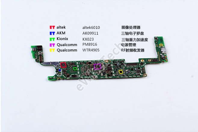主板背面主要包括了台湾altek公司的altek6010图像处理器芯片,AKM公司AK09911三轴电子罗盘芯片,Kionix公司的kx023三轴重力加速度芯片,高通公司的PM8916电源管理芯片和WTR4905射频收发器芯片。绿色的主板由UMT深圳公司生产。