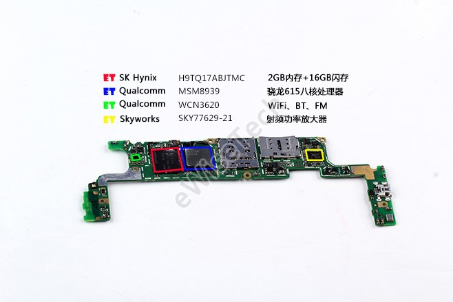 主板方面:正面主要包括一颗海力士H9TQ17ABJTMVC 2GB内存+16GB闪存芯片,高通骁龙615 MSM8939八核处理器芯片,高通WCN3620 WiFi、蓝牙4.0和FM集成芯片。美国SKYWORKS SKY77629-21射频功率放大器。