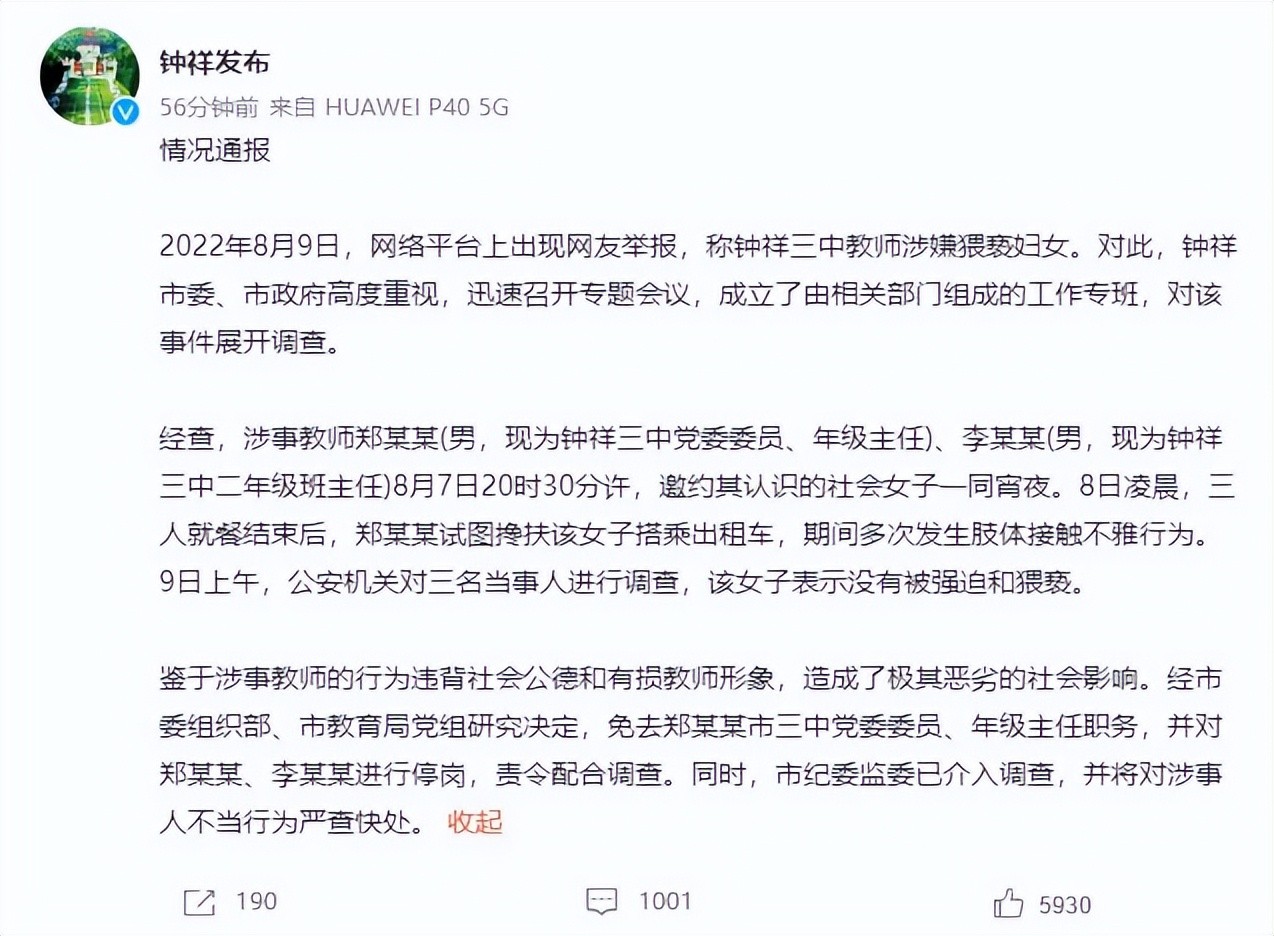 8月9日,有人在网络上举报有男子疑似当街猥亵妇女,且参与者为钟祥三中教师,并发布了现场录制视频。一时间舆论哗然。