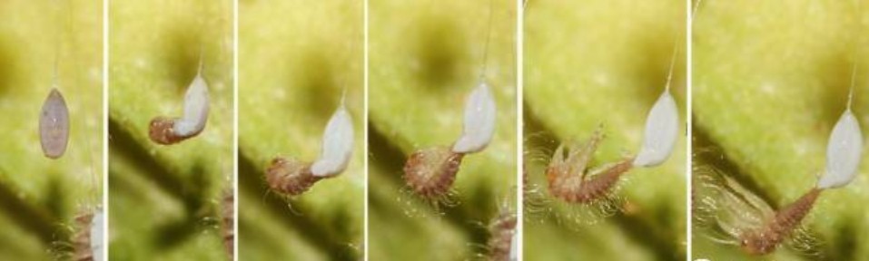 草蛉将虫卵尽量举高,为的是躲避蚂蚁等捕食者:蚂蚁 一般闷头赶路,头上两三厘米处是搜索盲区。幼虫破壳后, 会顺着细丝爬下,随即开始四 处搜捕蚜虫。草蛉幼虫极其能吃,一只就能吃掉六七百只蚜虫,由此得名“蚜狮”。如今, 蚜狮也和瓢虫一样被人工养殖,用以防治农林蚜虫害。