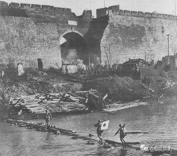 日军跨过浮桥。画中门洞即中华门东门门洞。1937年12月13日,进攻南京城的日军,正三三两两地跨过护城河进入南京城区。从这之后,日军便在南京城进行了惨绝人寰的大屠杀!