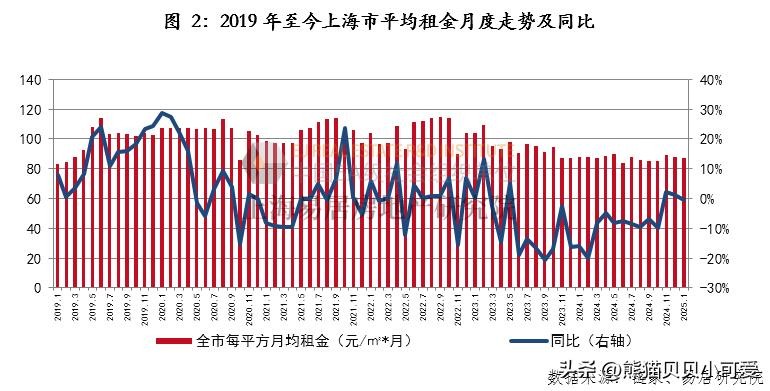2025年1月,上海的租金为87.15元/平方米/月,环比下降1.2%,同比由增转降0.6%,接近2018年水平。