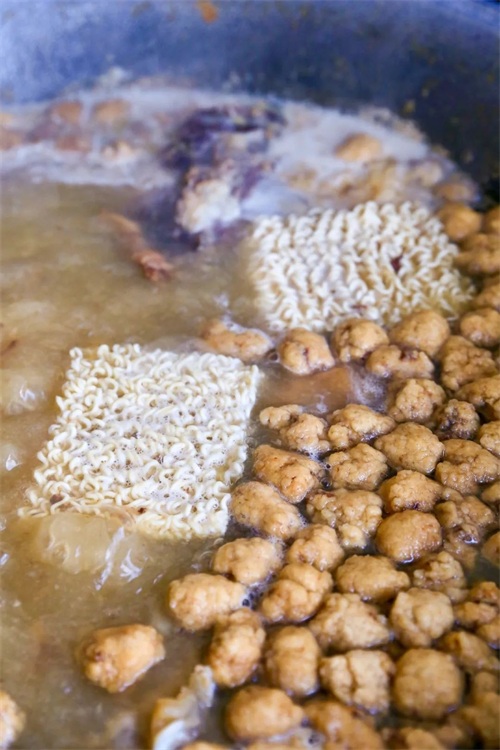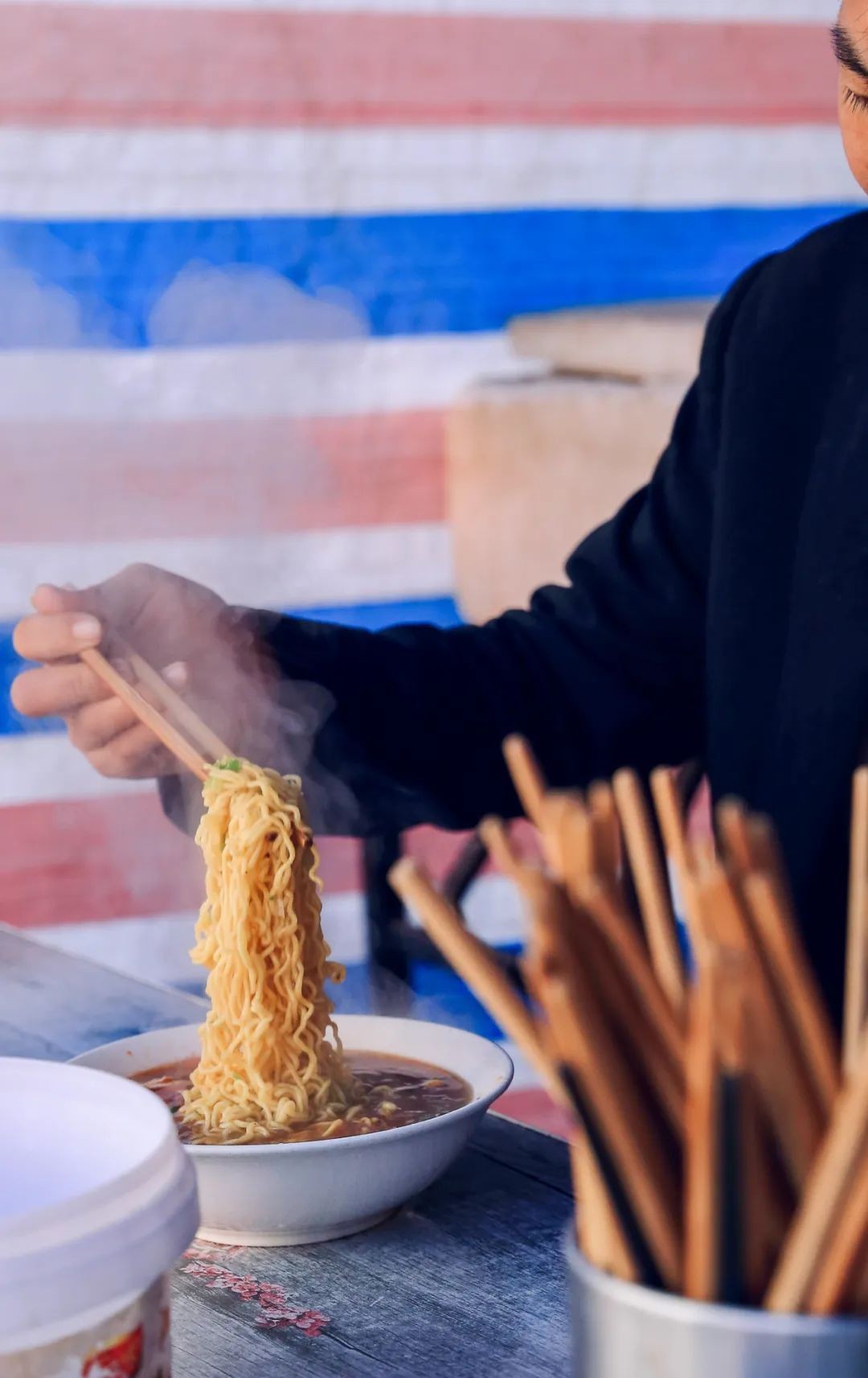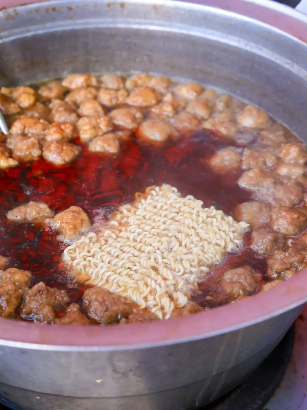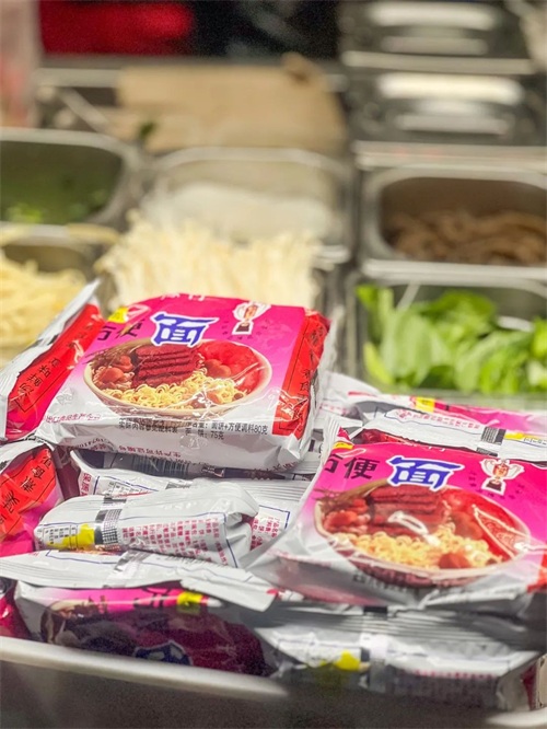 看向炉灶处,穿着围裙的小哥边翻搅着煮着大锅牛肉和另一个煮着肉丸的不锈钢汤锅,边转身麻利地撕开几包红白塑料包装的方便面,丢进后面另一锅咕嘟嘟沸腾着的汤锅里!
