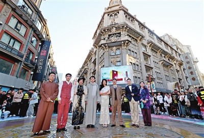 滨江道与和平路交口,实景演出的话剧《日出》引得游客驻足。 记者 姚文生 摄