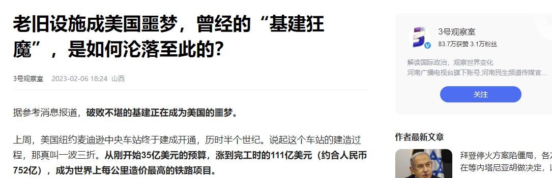 参考资料:3号观察室2023年2月6日——老旧设施成美国噩梦,曾经的“基建狂魔”,是如何沦落至此的?