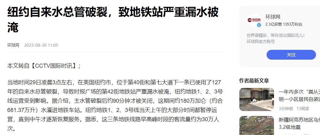 参考资料:环球网2023年8月30日——纽约自来水总管破裂,致地铁站严重漏水被淹