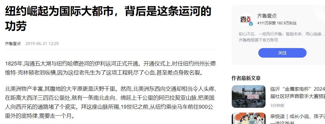参考资料:齐鲁壹点2019年6月21日——纽约崛起为国际大都市,背后是这条运河的功劳