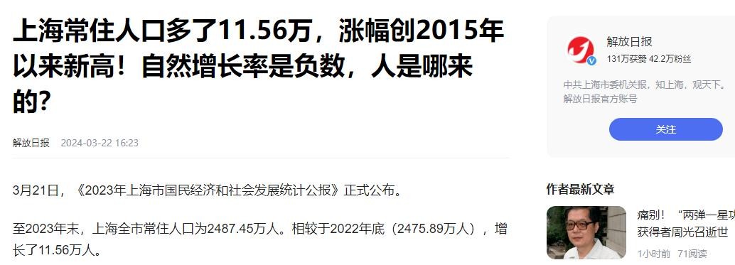 参考资料解放日报2024年3月22日上海常住人口多了11.56万,涨幅创2015年以来新高自然增长率是负数人是哪来的