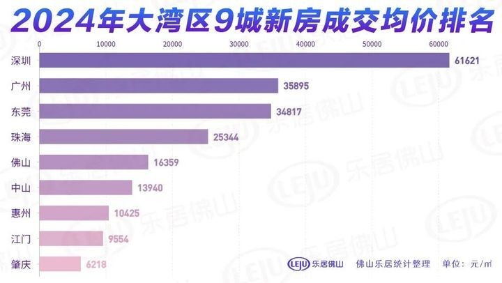 2024年各地新房均价上,深圳以超6.1万/㎡的均价稳坐湾区最贵之位;广州3.5万+/㎡位居第二;东莞3.4万+/㎡狂追其后;而佛山则以1.6万+/㎡排在第五,远低于第四位的珠海。
