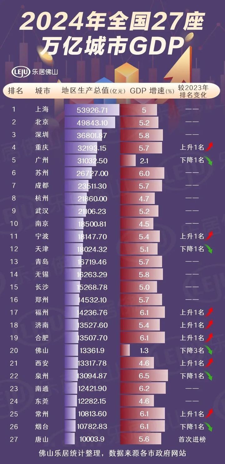 目前,广东省21市、全国27座万亿城市的GDP已全部集齐,哪些城市的经济“成绩单”表现亮眼?佛山排名变化如何?