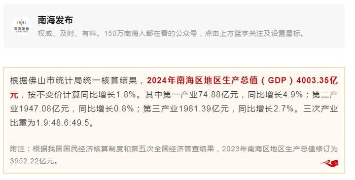 南海区公布数据显示,2024年全区地区生产总值为4003.35亿元,同比增长1.8%;